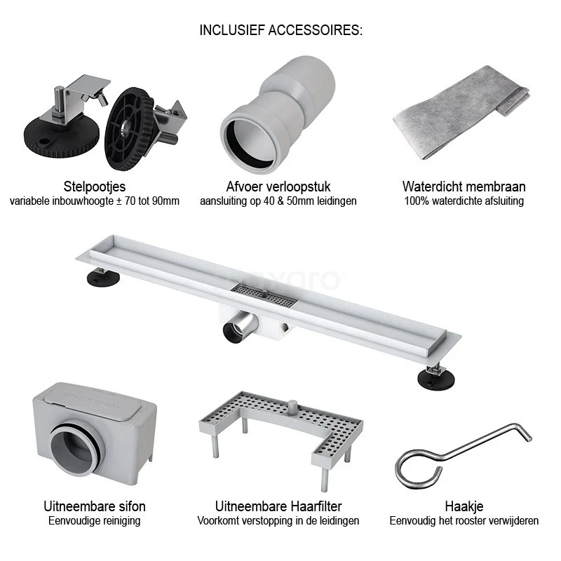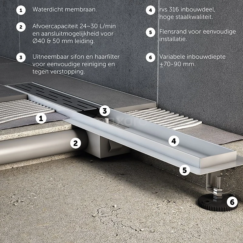 U ervaart ultiem onderhoudsgemak met dit model. Deze douchegoot heeft onder andere een haarfilter. Hierdoor zijn verstoppingen van uw leidingen voorgoed verleden tijd. Verder zorgt de flensrand en het waterdicht membraan voor een 100% waterdichte afsluiting. Daarnaast is de goot voorzien van een uitneembare sifon. Schoonmaken kost u op deze manier maar weinig tijd en moeite.