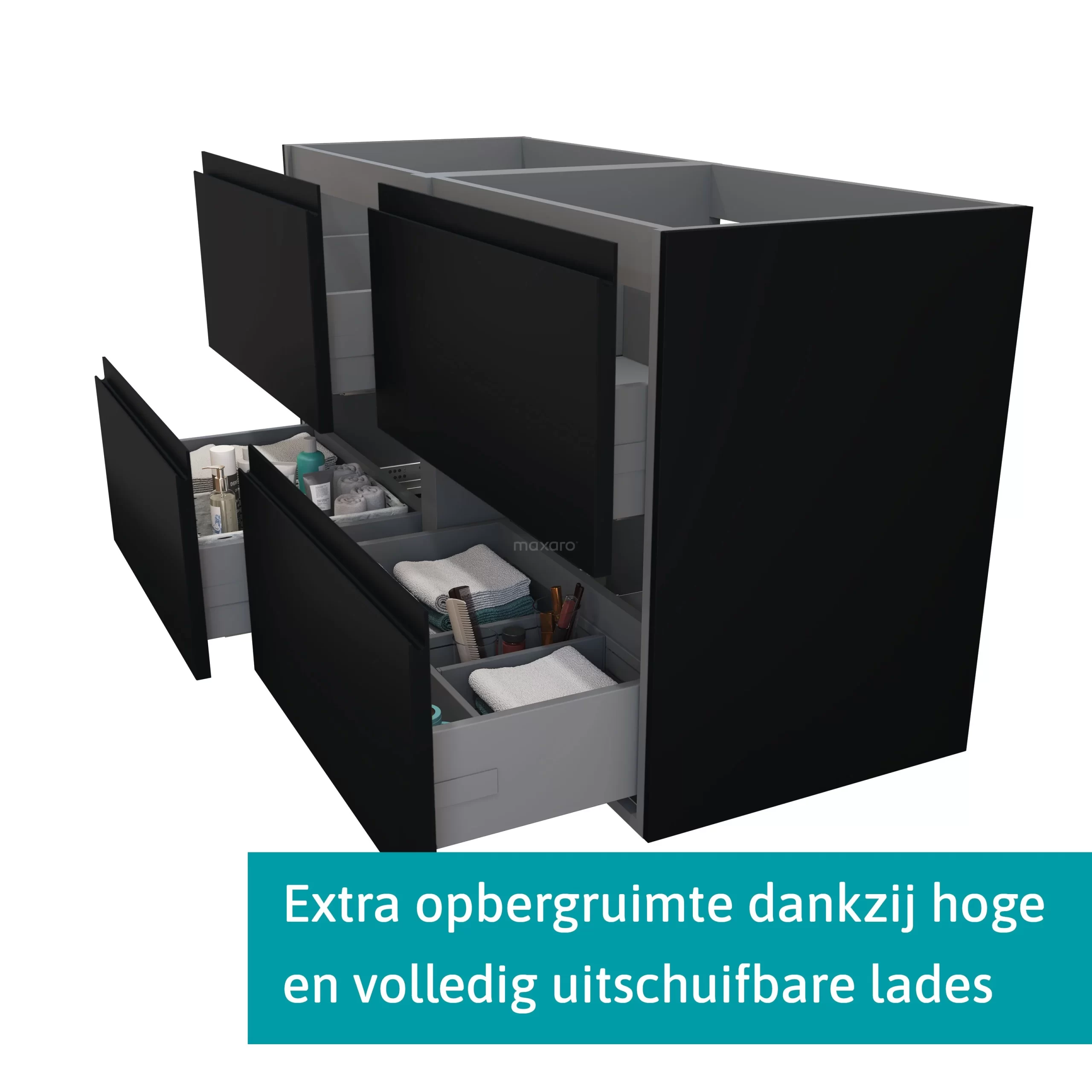 De onderkast is uitgerust met 4 lades, waarin u plaats heeft voor al uw badkamerspullen. Door het systeem met softopen en -close openen en sluiten de lades geluidloos. Bovendien zijn ze extra hoog en volledig uitschuifbaar. Verder heeft het meubel een slimme sifonuitsparing. Hierdoor benut u de beschikbare ruimte optimaal.