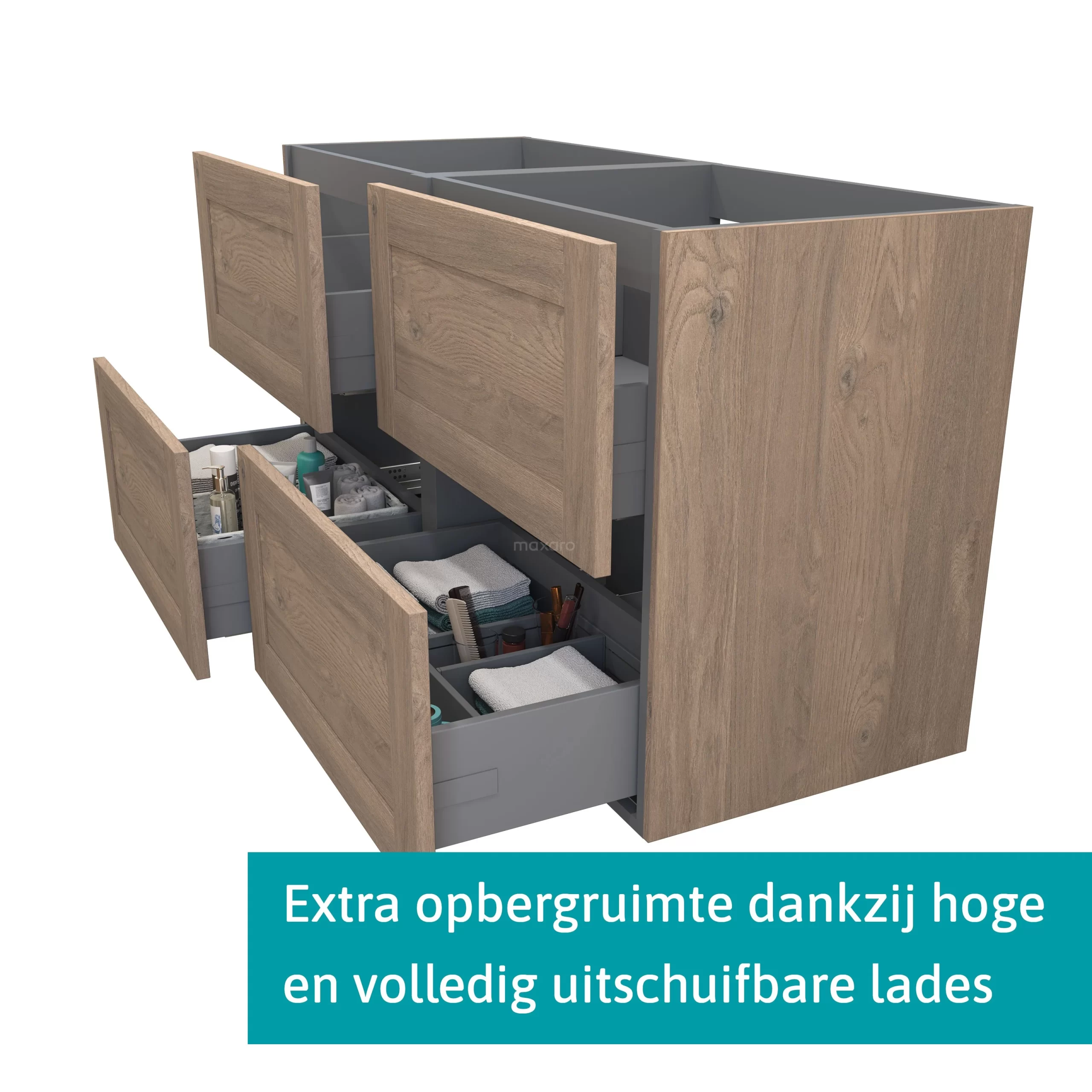 Dankzij het stijlvolle design is dit badkamermeubel de eyecatcher van uw badkamer. De onderkast is voorzien van een kaderfront en heeft een middenbruin eiken afwerking. Deze prachtige eikenlook creëert een warme sfeer in uw badkamerinterieur. Daarnaast zorgt het kaderfront voor een klassieke touch. De handgrepen dient u zelf toe te voegen. Deze zijn verkrijgbaar in verschillende kleuren en vormen.