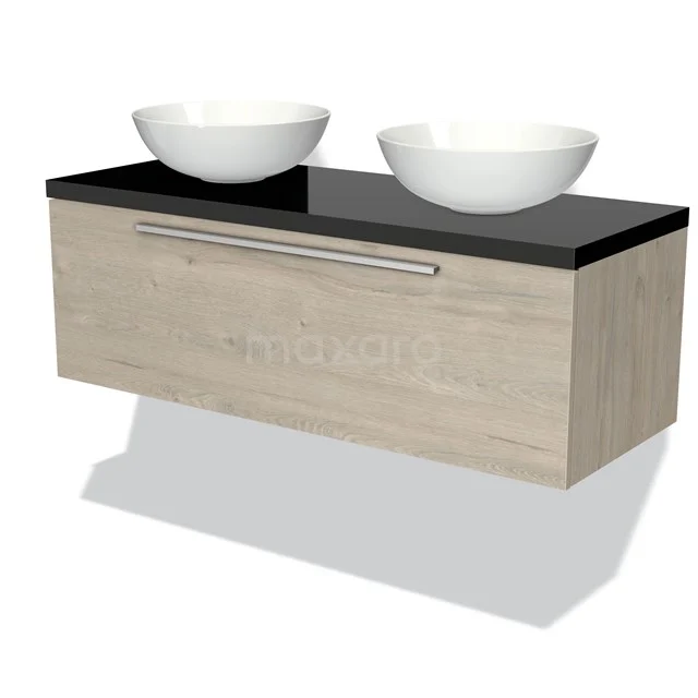 Dankzij het prachtige design is dit badkamermeubel de eyecatcher van uw badkamer. De lichtgrijs eiken onderkast heeft een sfeervolle uitstraling en is voorzien van een wastafelblad in hoogglans zwart. Daarnaast beschikt het meubel over een vlak front voor een tijdloze touch. De handgreep dient u zelf toe te voegen. Deze is verkrijgbaar in verschillende kleuren en vormen.