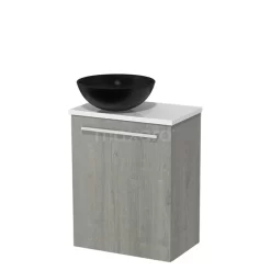 Dankzij het prachtige design is het meubel een blikvanger in de toiletruimte. De onderkast heeft een grijs eiken afwerking met een hoogglans wit wastafelblad.