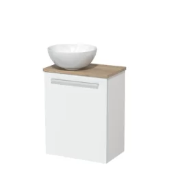 Dankzij het prachtige design is het meubel een blikvanger in de toiletruimte. De onderkast heeft een mat witte afwerking met een lichtbruin eiken wastafelblad.