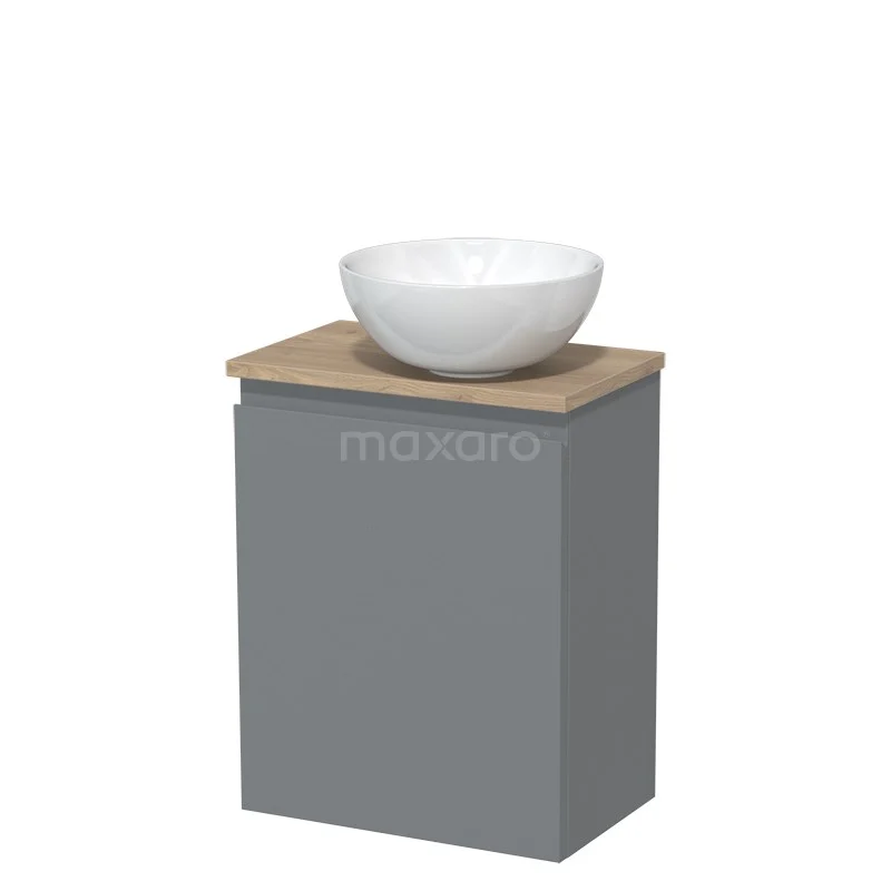 Dankzij het prachtige design is het meubel een blikvanger in de toiletruimte. De onderkast heeft een middengrijze afwerking met een lichtbruin eiken wastafelblad.