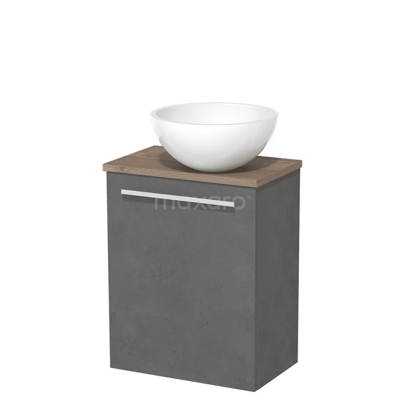 Dankzij het prachtige design is het meubel een blikvanger in de toiletruimte. De onderkast heeft een donkergrijze betonnen afwerking met een middenbruin eiken wastafelblad.