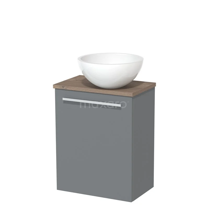 Dankzij het prachtige design is het meubel een blikvanger in de toiletruimte. De onderkast heeft een middengrijze afwerking met een middenbruin eiken wastafelblad.