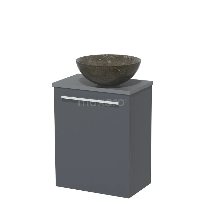 Het toiletmeubel is gecombineerd met een Novanta waskom. Deze stijlvolle waskom is gemaakt van natuursteen met een blue stone afwerking.
